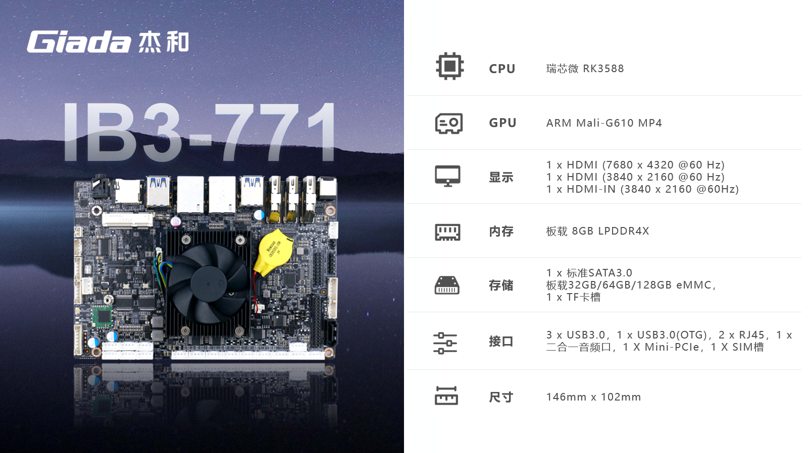 jinnianhui官网,金年会ARM主板IB3-771采用瑞芯微RK3588(4*A76+4*A55@2.4GHz)八核64位处理器,集成ARMMali-G610 MC4 GPU,内置AI加速NPU,提供6TOPs算力,板载8GB LPDDR4X内存,支持8K@60fpsH.265/VP9视频解码和8K@30fps H.264视频编码,进行图像及视频的高效采集和处理,可广泛应用于交互式智慧显示屏、智慧显示一体机、智能自助终端等场景。