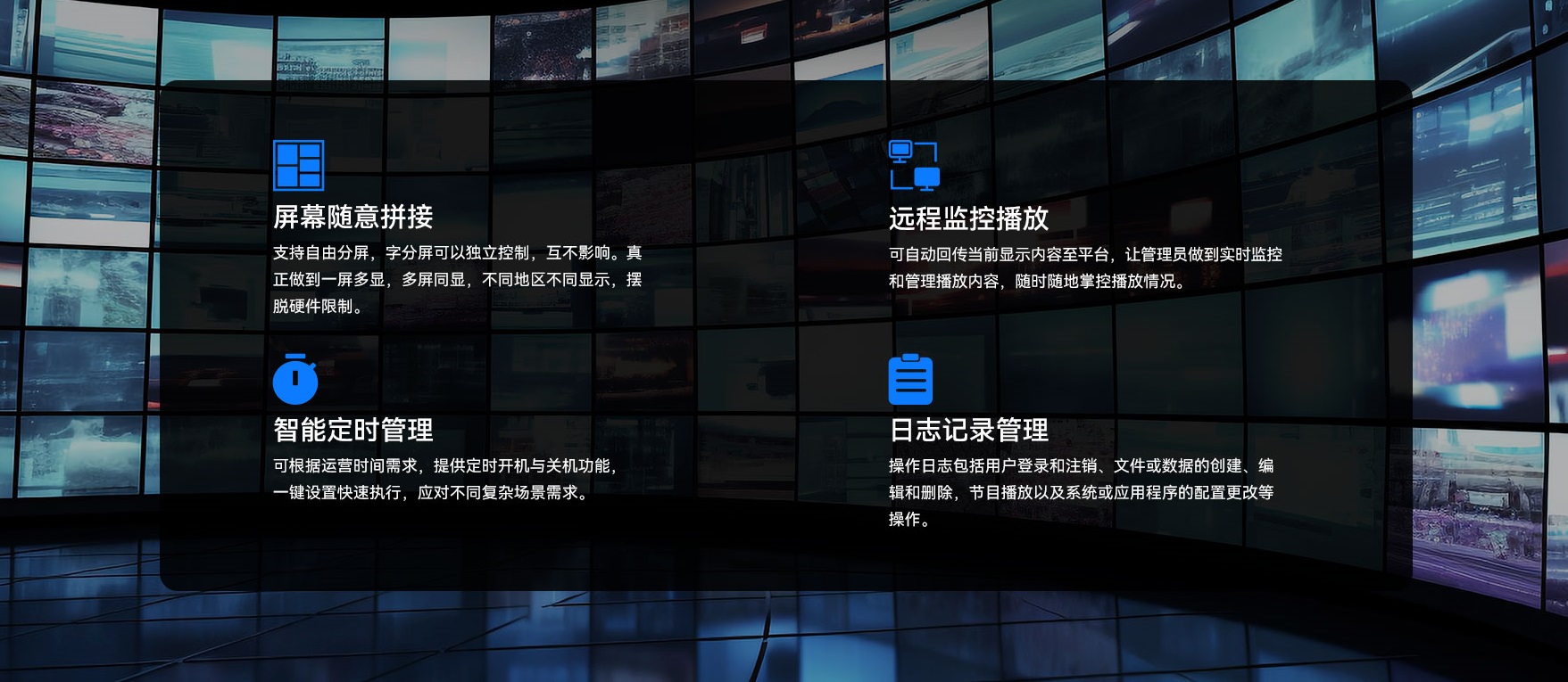 jinnianhui官网,金年会GDSM-ES智能零售管理系统可 实现多屏拼接/多屏分离自由选择,也可画中画显示,用户可根据场景自行灵活安排,更可以异形屏幕显示安排,让广告显示更加丰富多彩。同时,还可以轻松查看设备的基本信息,如连接状态、播放状态、播放到期时间,屏幕类型等;可对设备进行分组远程管理,远程设置定时开关机时间,控制设备音量,远程重启、远程升级,远程截屏查看实时画面等,实现屏幕智能管理。