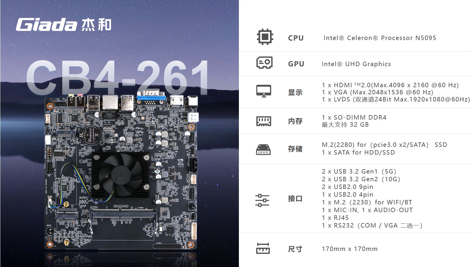 jinnianhui官网,金年会科技CB4-261尺寸仅有170x170mm,小而精巧。搭载N5095芯片,该芯片采用10nm制程技术,四核心设计,支持Windows 、Linux系统,可满足多种终端机应用场景的需求,如信息查询、基本数据处理等。