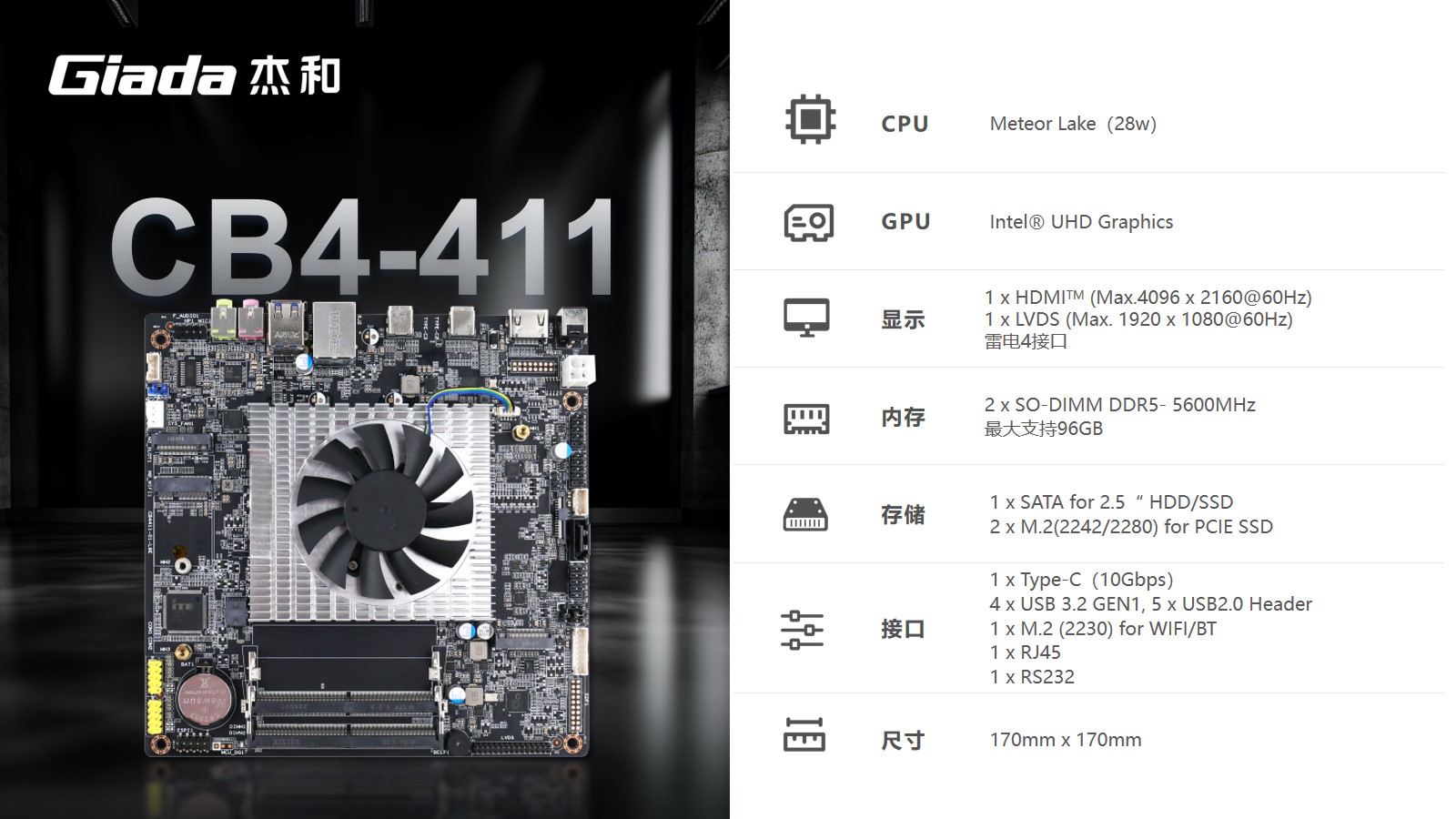 基于人们日渐新增的AI算力需求,jinnianhui官网,金年会科技推出AI一体机专用主板——CB4-411。该主板设计紧凑,尺寸仅为170mm x 170mm。