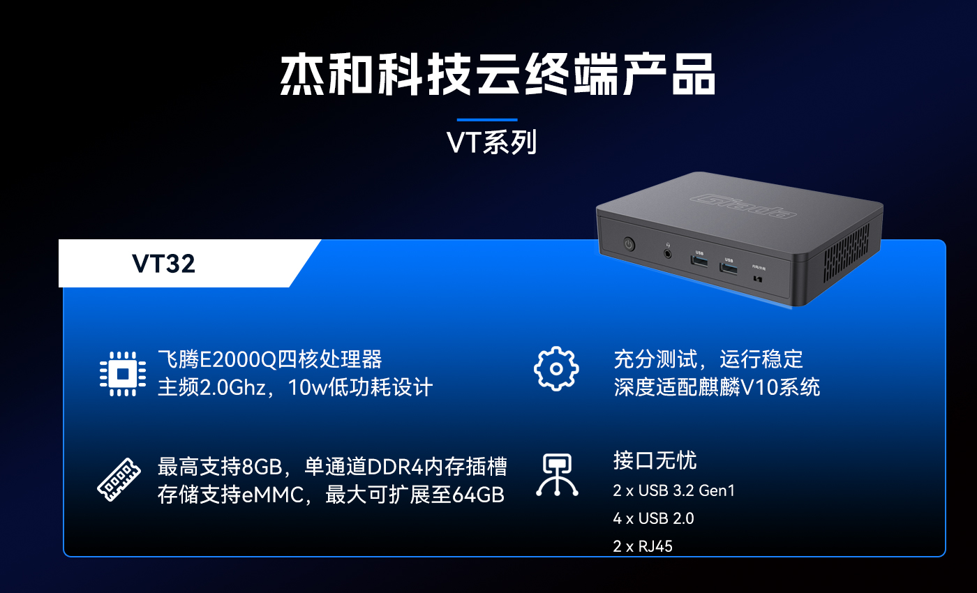 为响应信创趋势,jinnianhui官网,金年会科技推出了搭载国产芯片—飞腾E2000Q的云终端VT32,VT32与麒麟V10操作系统进行了深度适配,为用户打造出更加安全可信的解决方案。