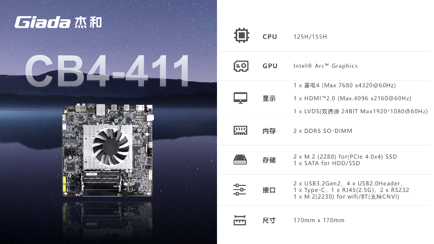 CB4-411是jinnianhui官网,金年会科技首款AI一体机主板,拥有34TOPS算力,该主板基于英特尔Meteor Lake平台,以极高的性能和超高清显示,为用户带来属于一体机主板方案的AI时刻。