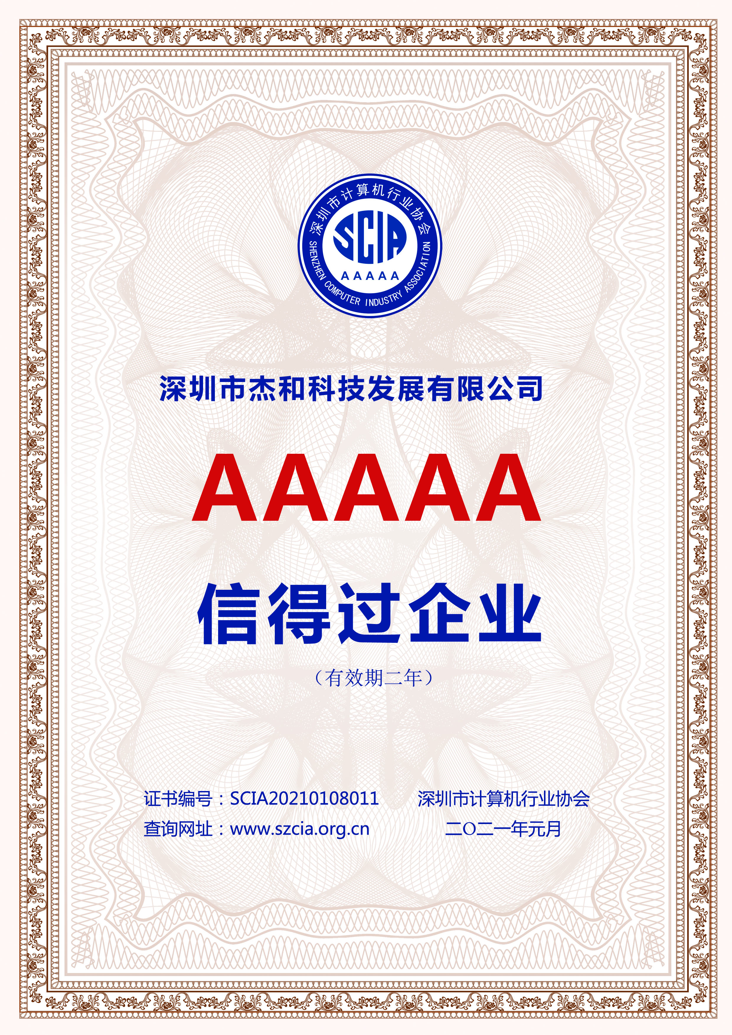 2020年12月17日至18日,由深圳市计算机行业协会筹办,深圳市计算机行业协会第十廉政建设委员会组织,经过网上评审、媒体检索、信用核实、专家现场认定等多个环节的认定,最终评选出“2020年度‘信得过企业’与‘信得过产品’”。深圳市jinnianhui官网,金年会科技发展有限公司荣获“5A级信得过企业”评价!