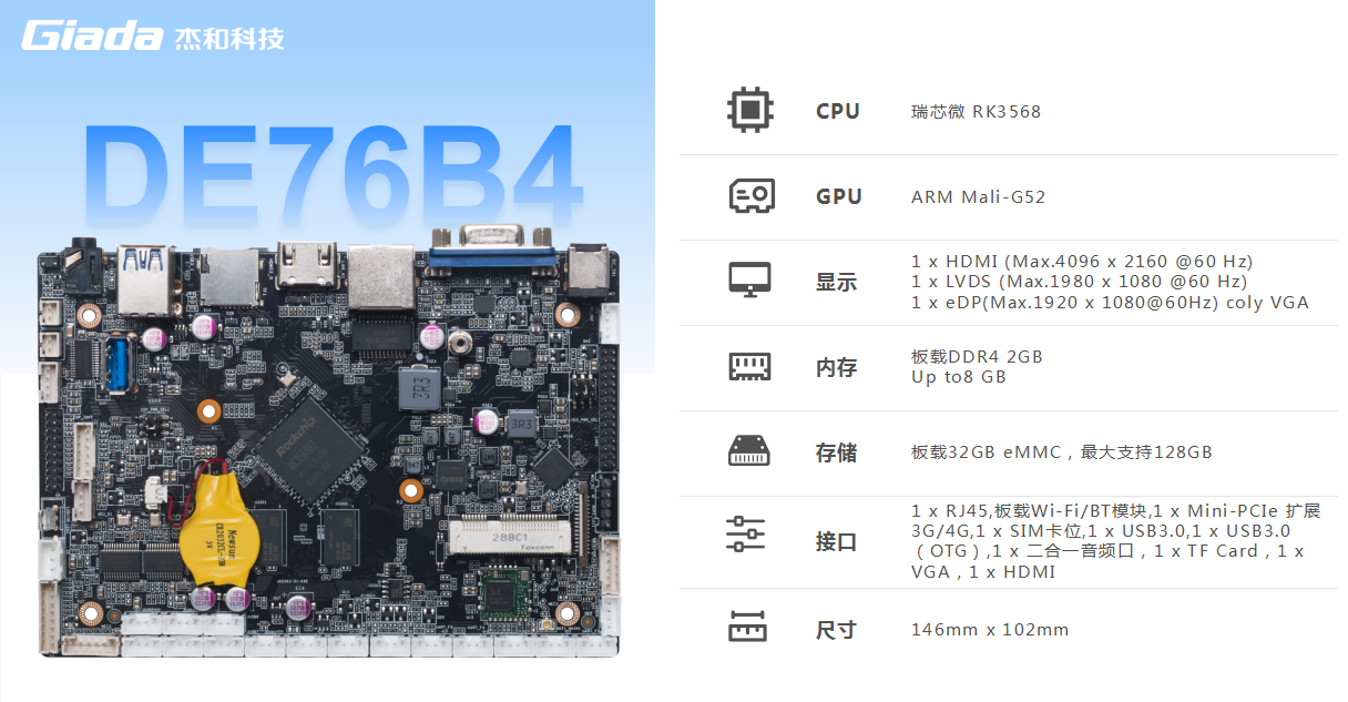 jinnianhui官网,金年会科技DE76B4采用瑞芯微RK3568处理器,板载DDR4内存,可实现多任务并行、更大数据集的高效处理,丰富的接口,具有性能强、内存大、集成度高、扩展能力强等特点,支持在宽温、复杂电磁等恶劣环境下稳定运行,可广泛应用于物联网网关、边缘存储、工控平板、工业检测、工控盒、自助终端、云终端、车载中控、机器人等行业定制市场。