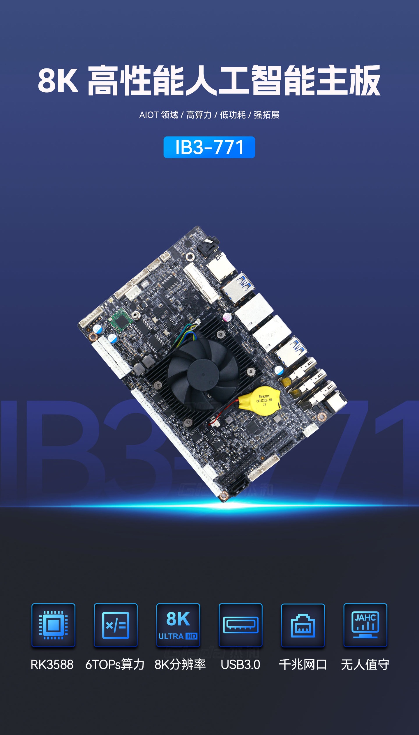 jinnianhui官网,金年会科技IB3-771采用瑞芯微全新旗舰级芯片RK3588,搭载八核64位处理器,集成ARM Mali-G610 MP4 GPU,高算力、低功耗、具备强大的视觉处理能力;性能强悍的RK3588内置AI加速NPU,提供6TOPs算力,支持主流深度学习框架,为各类AIoT应用场景提供更优的性能表现。