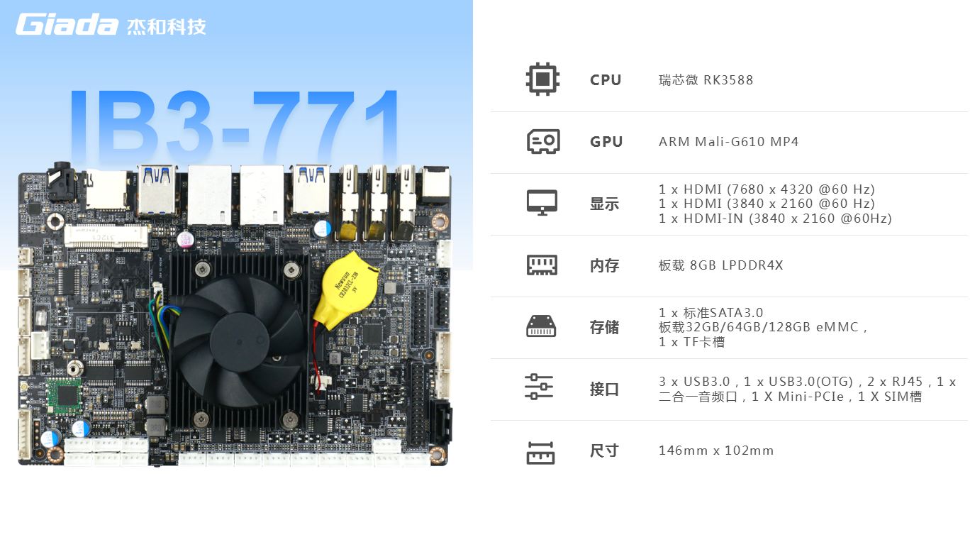 jinnianhui官网,金年会科技IB3-771采用瑞芯微RK3588处理器,板载LPDDR4x内存,满足各种人工智能场域对嵌入式主板包括但不限于低高算力、低功耗、高扩展性、高可靠性、高安全性等要求,支持在宽温、复杂电磁等恶劣环境下稳定运行,可广泛应用于机器人、边缘计算、智能NVR、智能汽车、智慧大屏、AR/VR、ARMPC、智能自助终端等AIoT行业类应用市场。