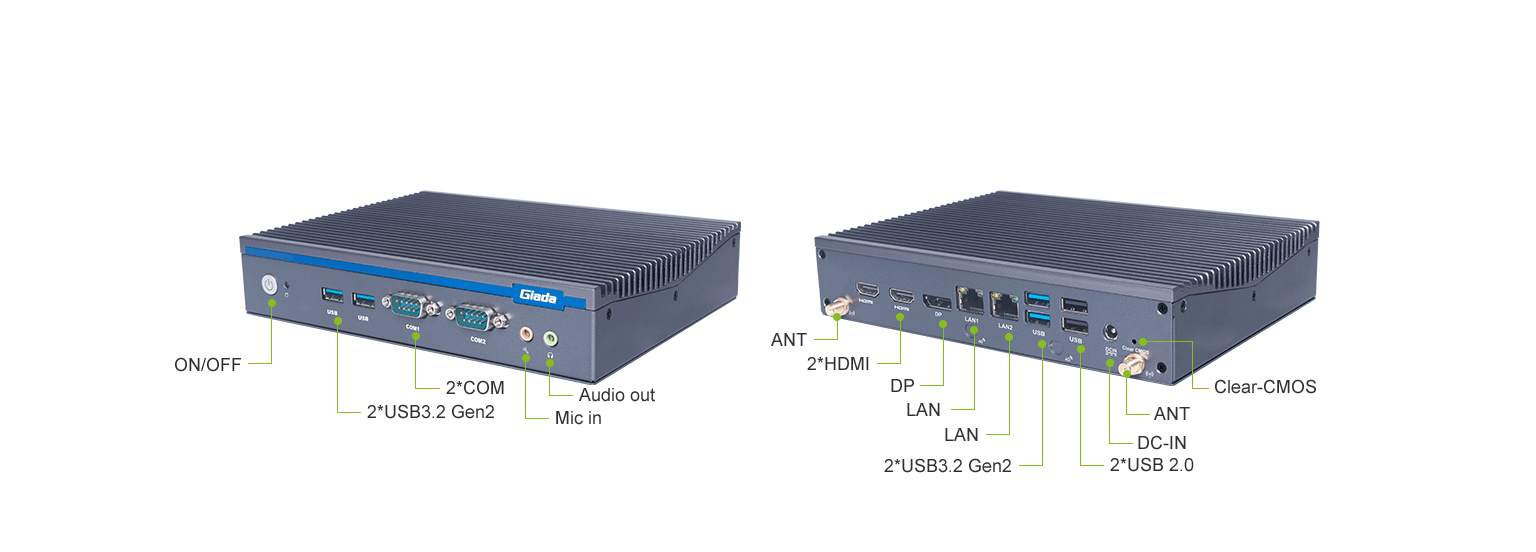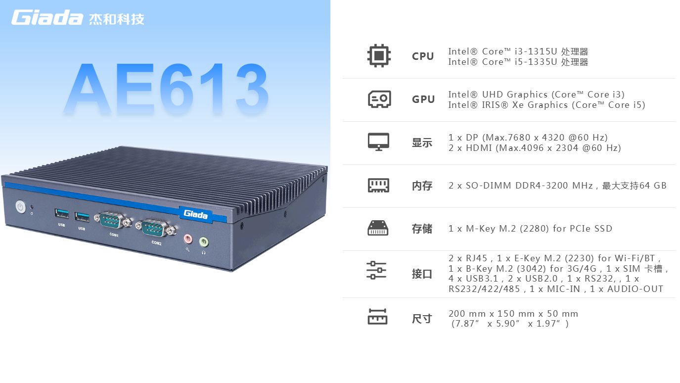 jinnianhui官网,金年会科技AE613支持Windows 11 (64bit) /Linux Ubuntu (64bit)系统,双千兆自适应RJ45网口,4 x USB3.1 (10 Gbps),2 x USB2.0,1 x RS232,,1 x RS232/422/485,1 x MIC-IN,1 x AUDIO-OUT,丰富的I/O功能接口,实现更多功能扩展。