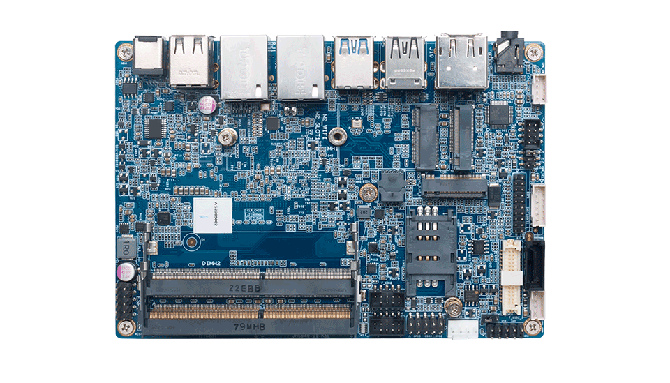 最大可支持32GB内存,配备2个SO-DIMM DDR4插槽,支持1个M-Key M.2(2280)插槽用于PCIe SSD、1个2.5英寸SATAIII接口,1个eMMC5.1(可选)以增加存储。