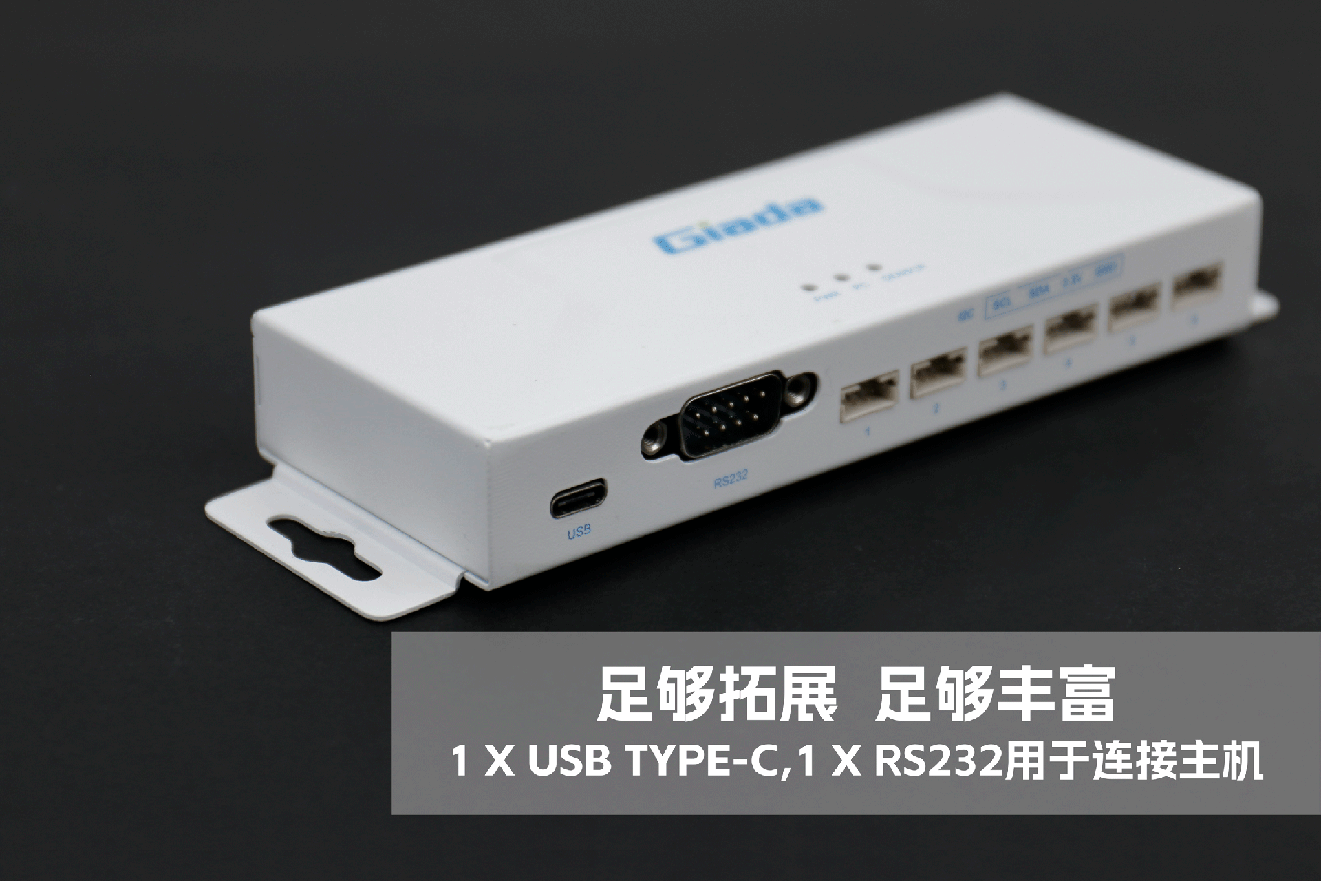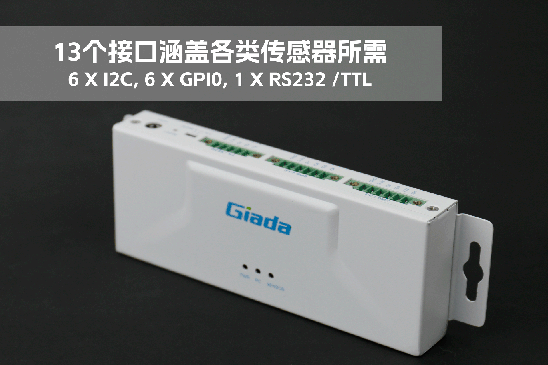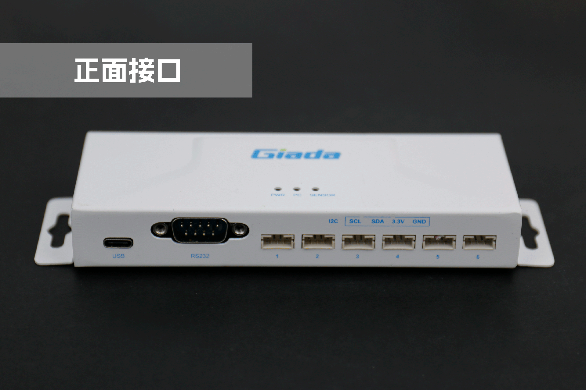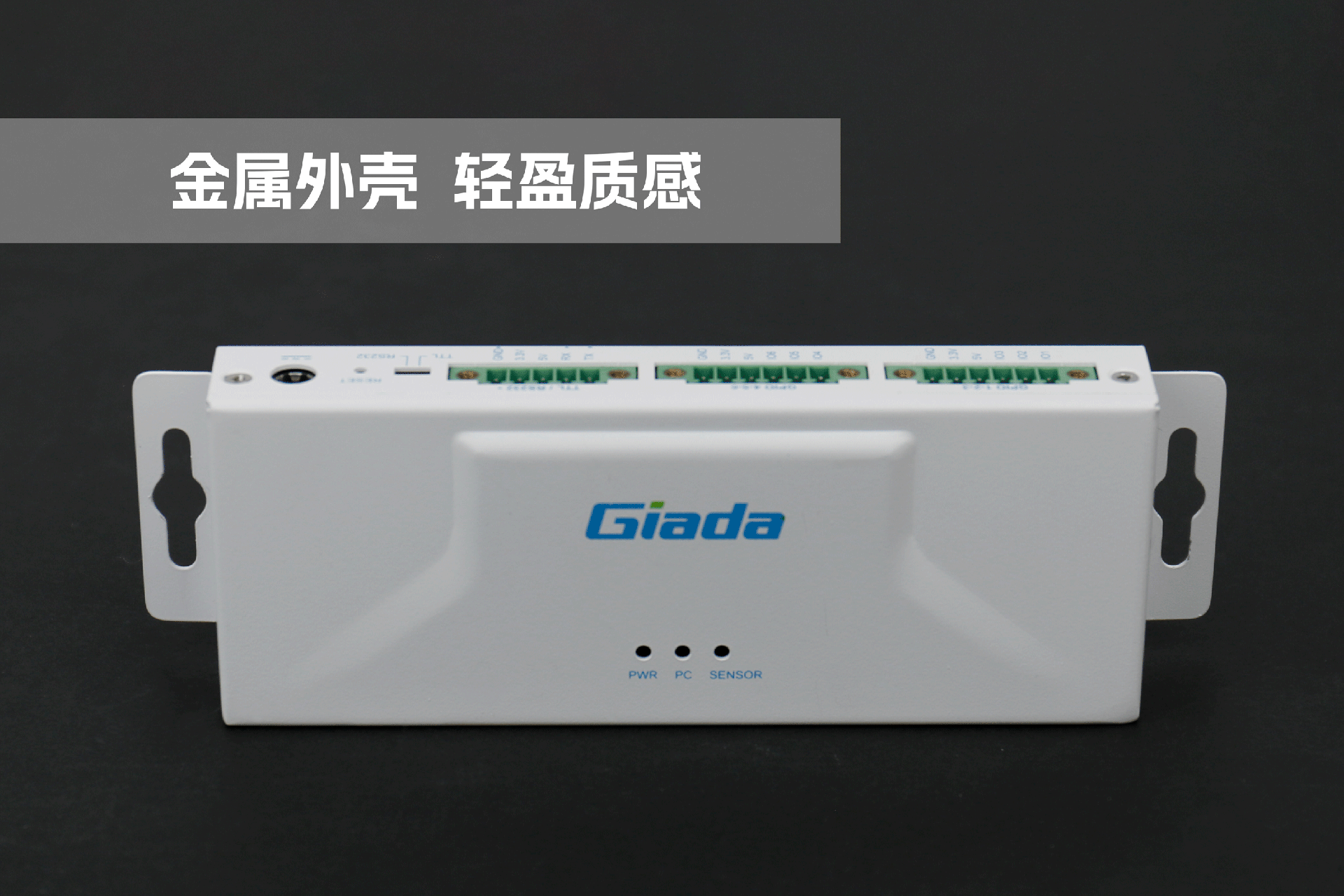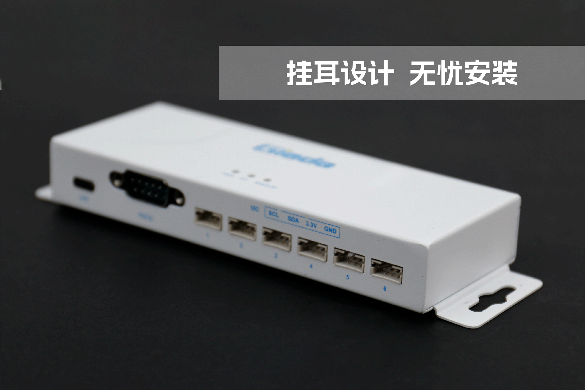 jinnianhui官网,金年会物联网拓展坞RD01外部为白色,顶部印制jinnianhui官网,金年会Giada的彩色logo,外壳采用金属材质,左右两侧设计同材质挂耳,可以方便用户固定设备。