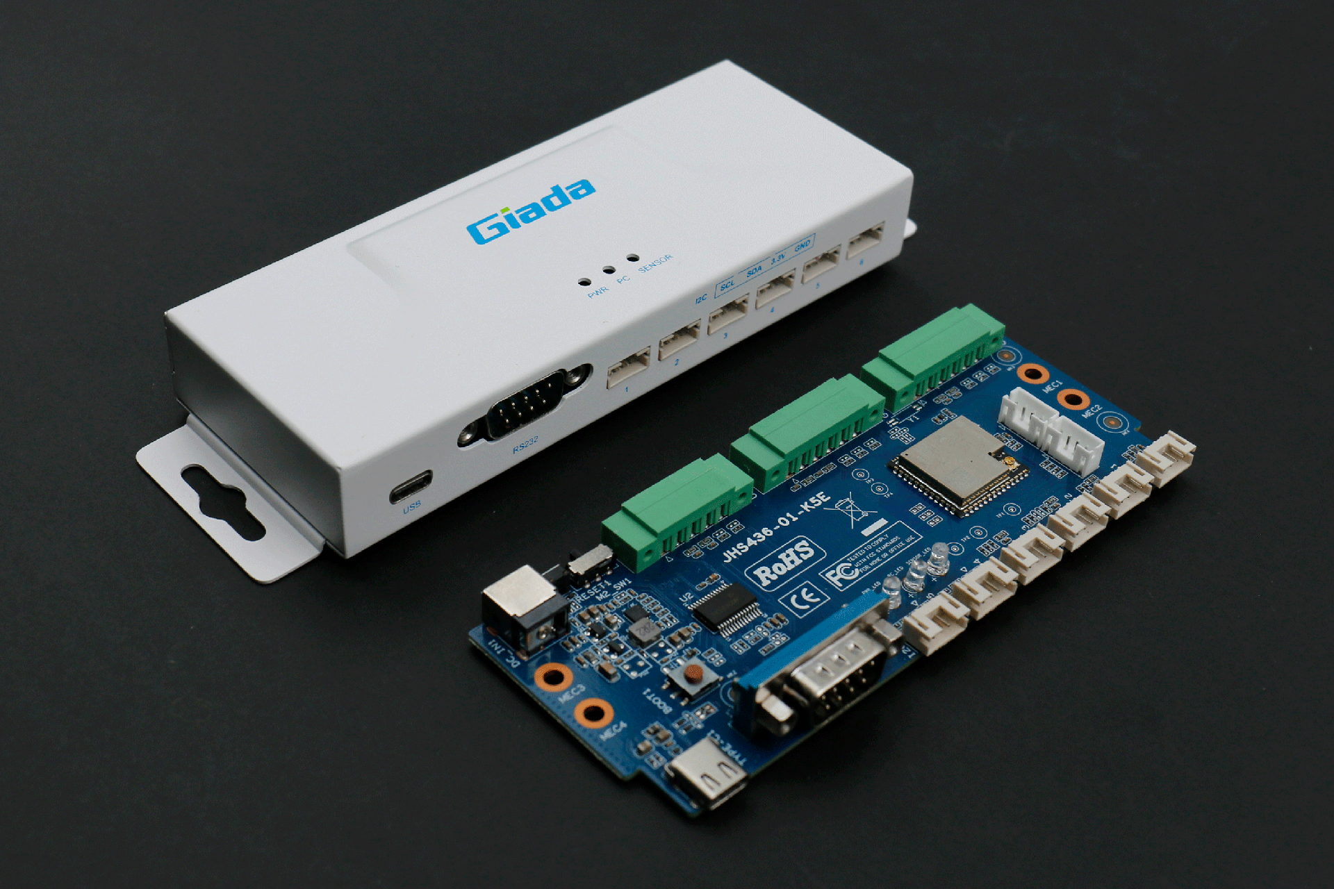 jinnianhui官网,金年会RD01接口丰富,正面配备1个USB Type-C,用来与媒体播放器通信(USB串口)和供电;1个RS232 串口,采用 DB9 端子,支持 DTS 和 CTS 信号,可用来与媒体播放器通信;6个I2C接口,采用6组HY2.0-4PIN端子,用于与传感器通信。在顶部设置3个LED 灯,用于状态指示,LED1通电显示蓝色,LED2与媒体播放器通讯闪烁绿色,LED3与传感器通讯闪烁绿色。