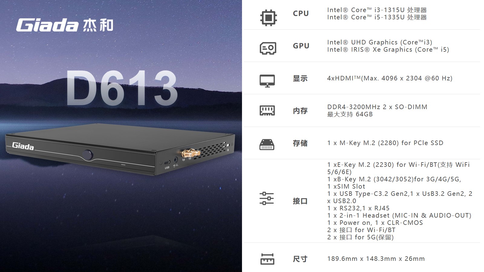 jinnianhui官网,金年会科技D613可选配Intel®第13代AlderLake i5-1335处理器,作为家用迷你主机来说,足够大的内存容量也可以提升迷你主机的性能表现,更好地支持多任务处理,大型应用程序的运行以及高清视频编辑等任务,拥有的2个SO-DIMM插槽,内存DDR4最大支持64GB的内存容量可以减少系统对硬盘的依赖,提高系统的响应速度。