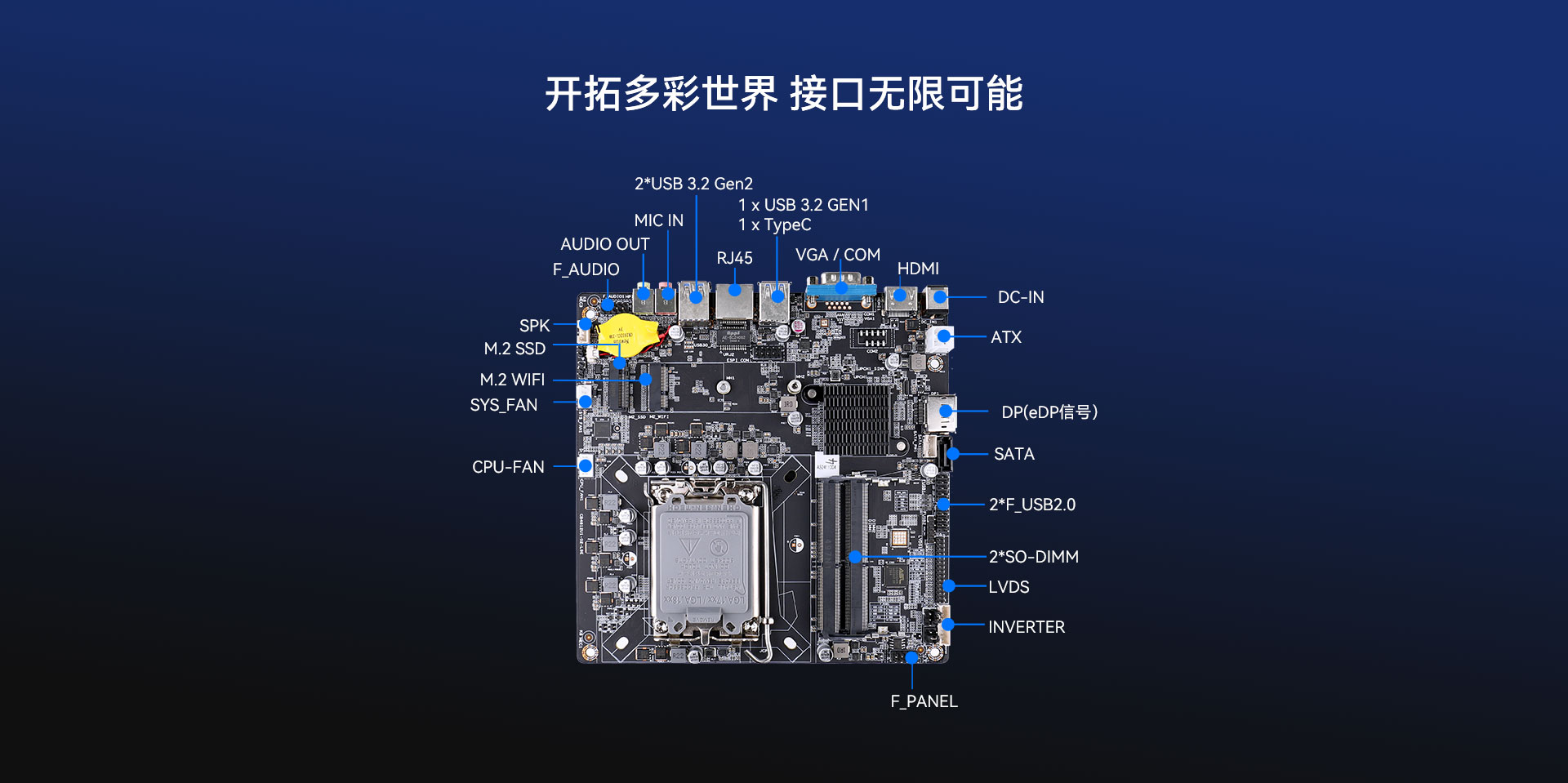 | 外部I/O | 接口 | 1 x USB 3.2 Gen1 1 xType-c 2 x USB 3.2 Gen2 1x VGA (Max.2048 x 1536@60Hz) 1x HDMI 2.0 (Max.4096x2160@60Hz) 1x LVDS( 双通道 24Bit Max.1920*1080@60Hz/100Hz/120Hz) 1 xDP (Max.4096 x 2160@60Hz) 1 x MIC-IN, 1 x AUDIO-OUT 1 x RJ45 1 x RS232(COM / VGA 二选一) |