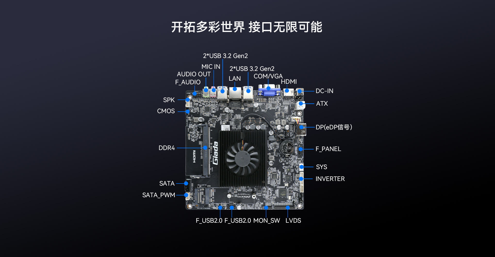| 外部I/O | 接口 | 4xUSB3.2Gen2(10G) 1xVGA(Max.2048x1536@60Hz) 1xHDMI™2.0(Max.4096x2160@60Hz) 1xLVDS(双通道24Bit Max1920*1080@60Hz/100Hz/120Hz) 1xMIC-IN,1xAUDIO-OUT 1xRJ45(1000M) 1xRS232(COM/VGA二选一) |